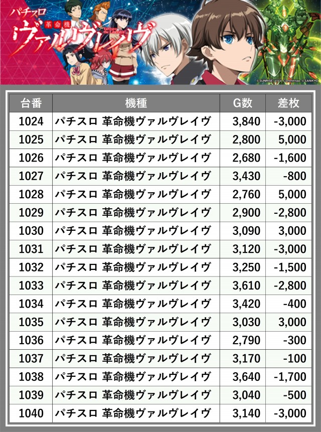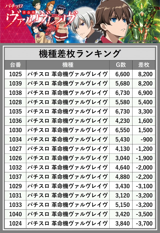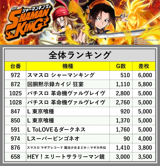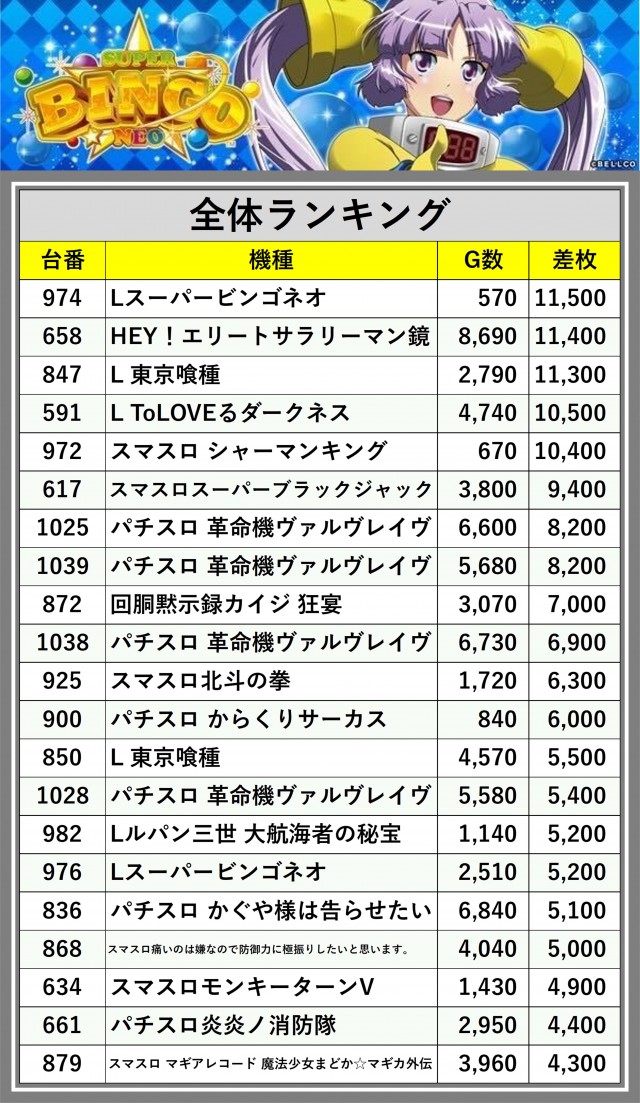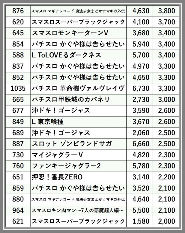 ※差枚数順に掲載しています