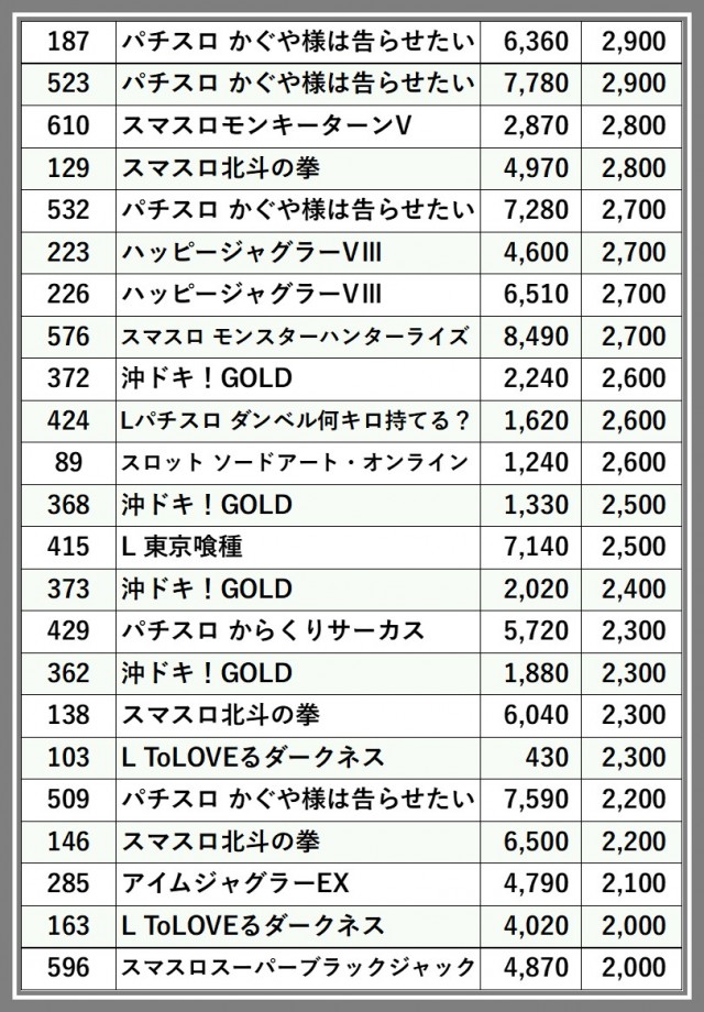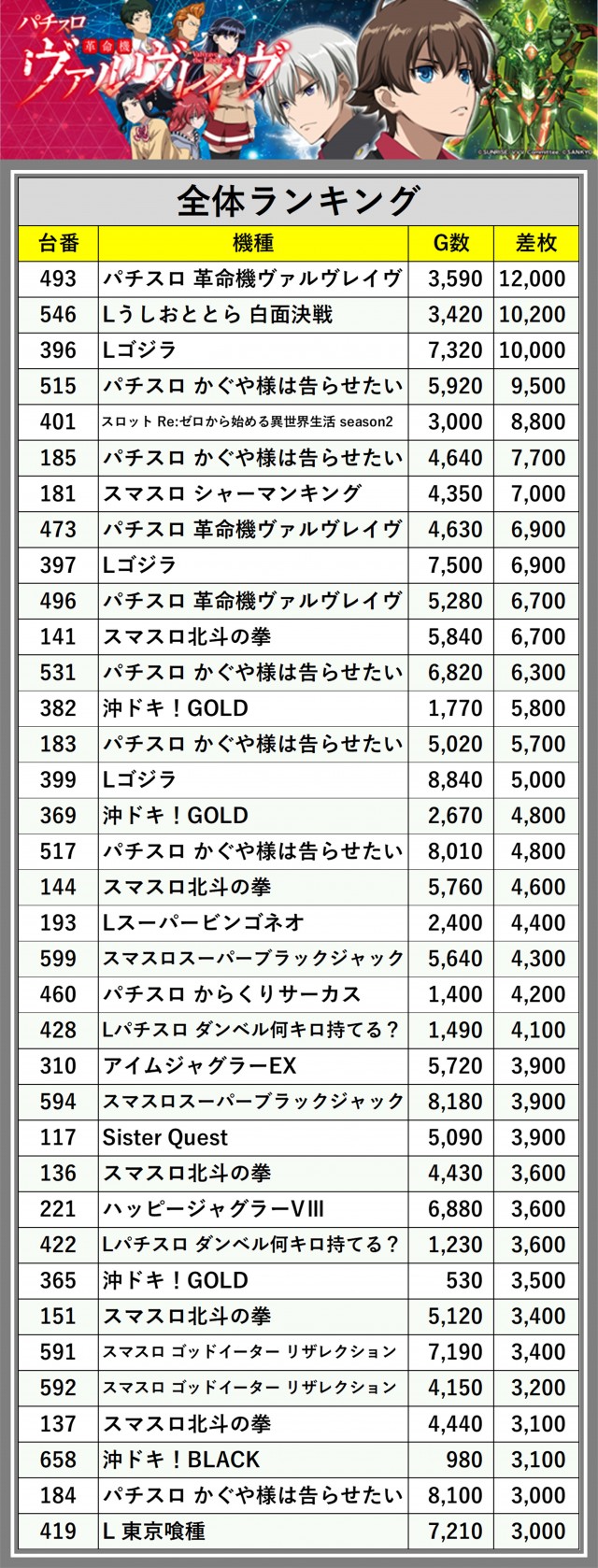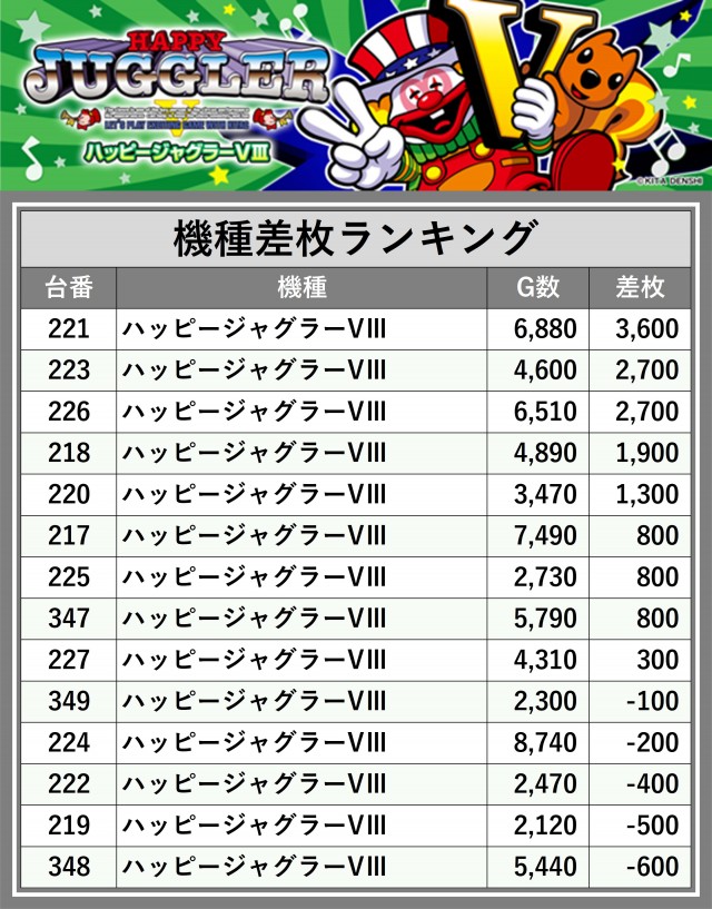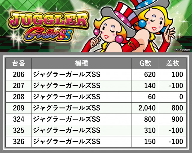 厳選された取材対象機種をはじめ、その他スロット全体から好記録が飛び出した!プレイヤーが楽しんだ1日を下記データにて振り返ってみて欲しい。
