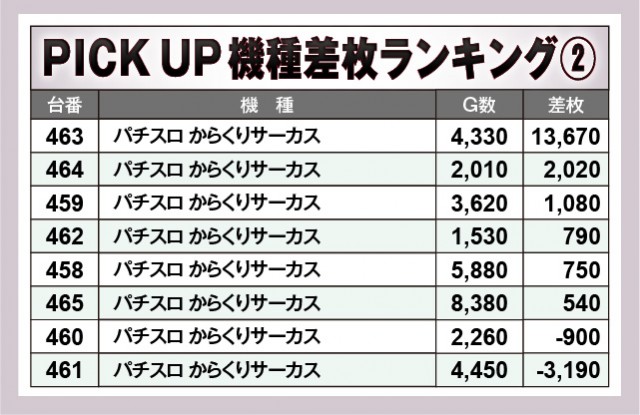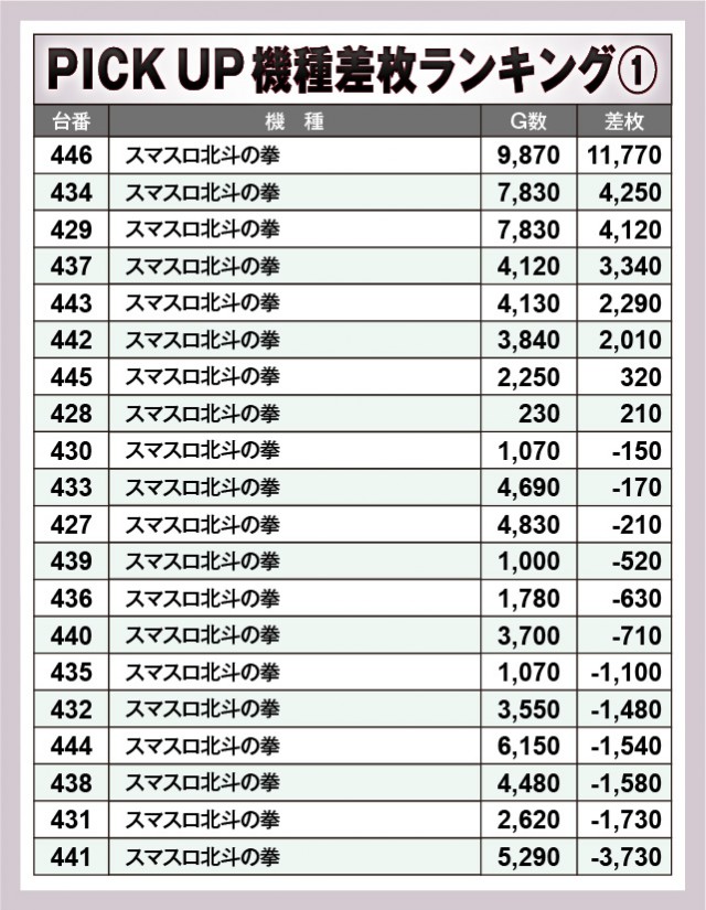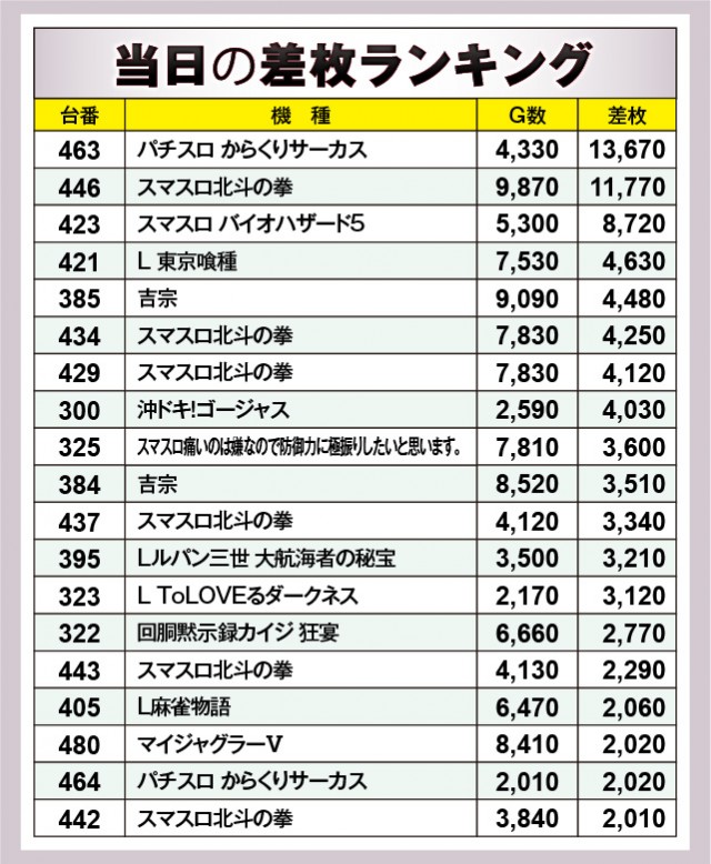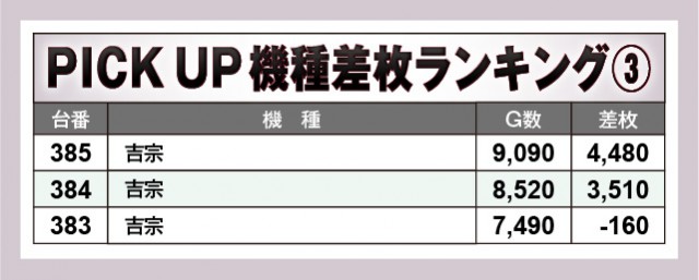 万枚OVERを達成した『スマスロ北斗の拳』『パチスロ からくりサーカス』の存在感は大きく、特に後者は半数以上でプラス差枚数を築いている点も見逃せないポイントだ。そしてまとまった出玉を確保していた台は『吉宗』も同様で、惜しくも全台プラス差枚とはならなかったが、大きな熱気を放っていた。終日を通して打ち込まれていた形跡も好感を覚える部分で、ファンは有意義な時間を過ごしていたことだろう。