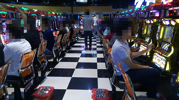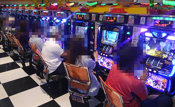沖スロコーナーの稼働率も高く、笑顔で遊技をおこなうプレイヤーが多い。