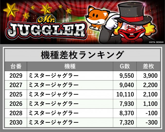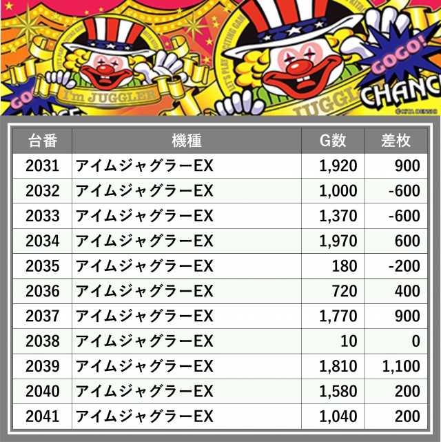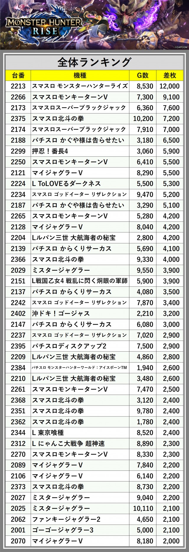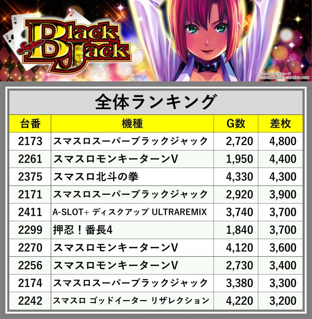 厳選された取材対象機種をはじめ、その他スロット全体から好記録が飛び出した!プレイヤーが楽しんだ1日を下記データにて振り返ってみて欲しい。