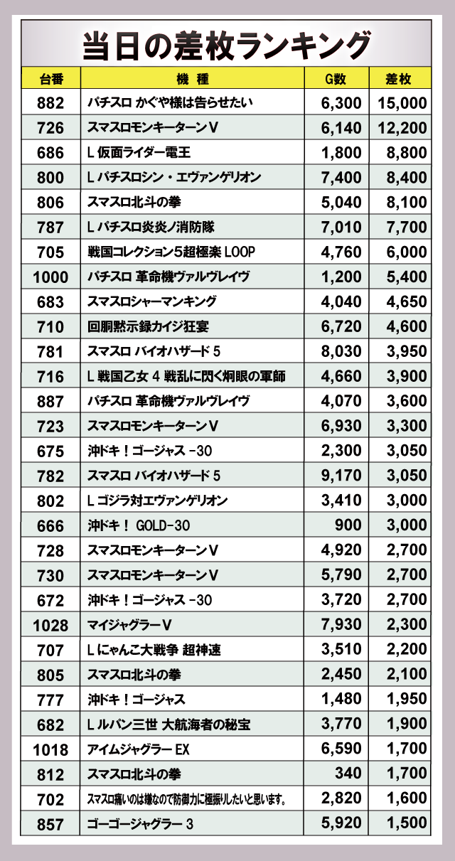 ※差枚数順に掲載しています。