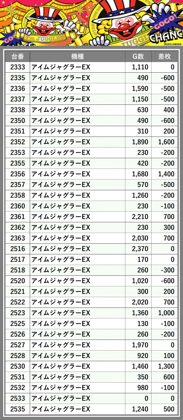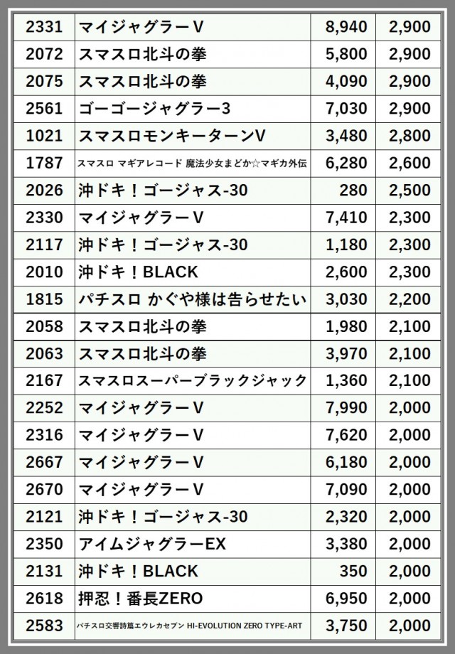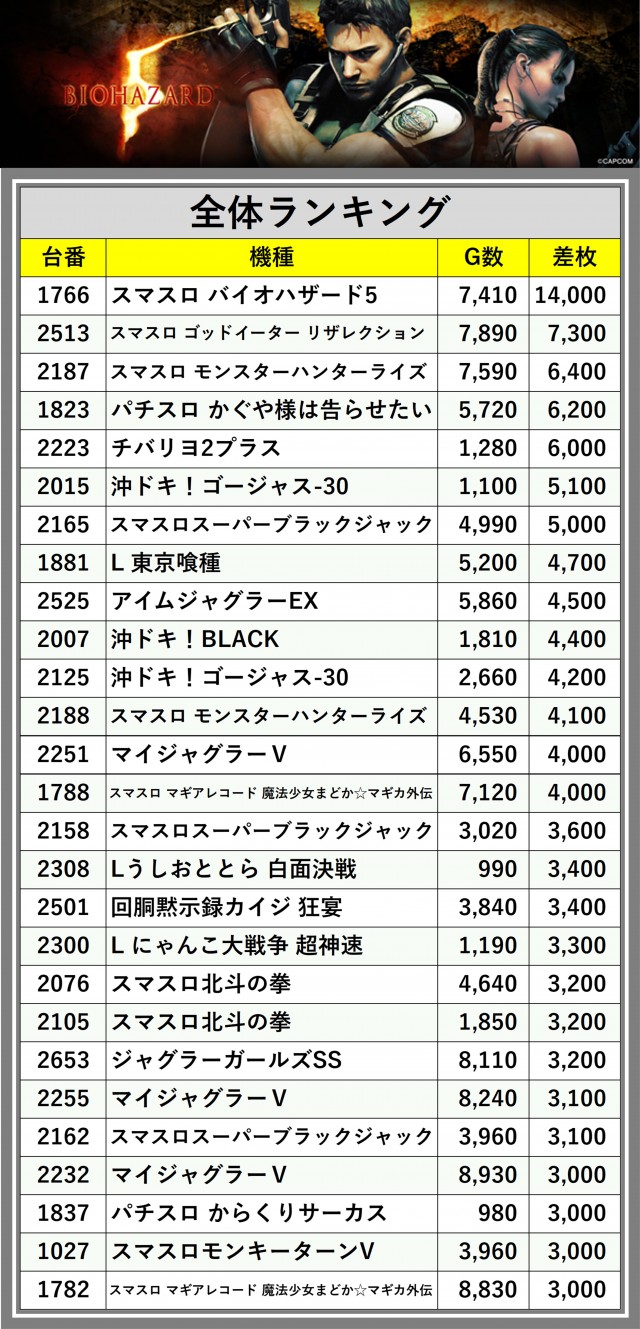 厳選された取材対象機種をはじめ、その他スロット全体から好記録が飛び出した!プレイヤーが楽しんだ1日を下記データにて振り返ってみて欲しい。