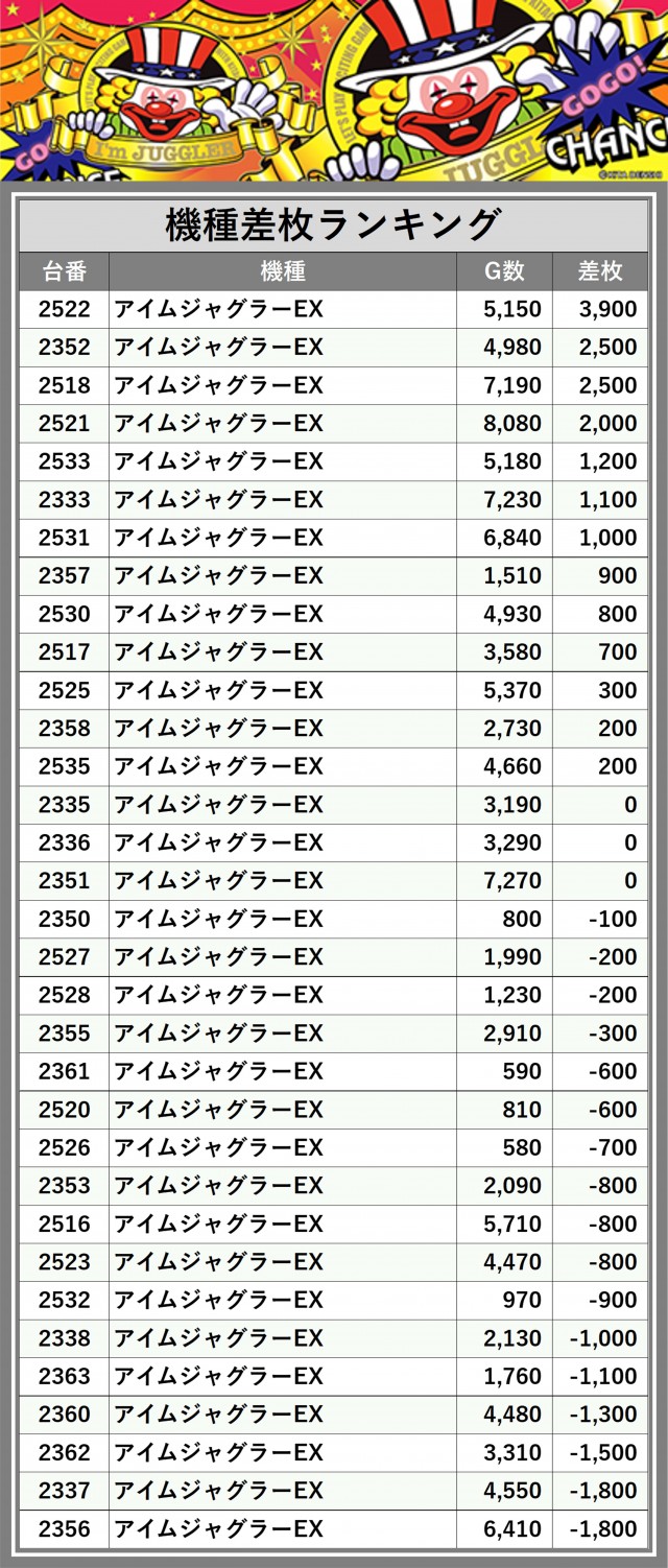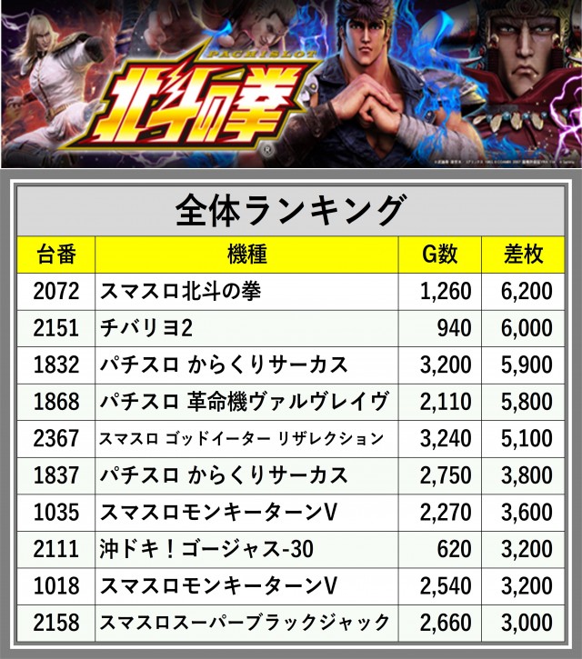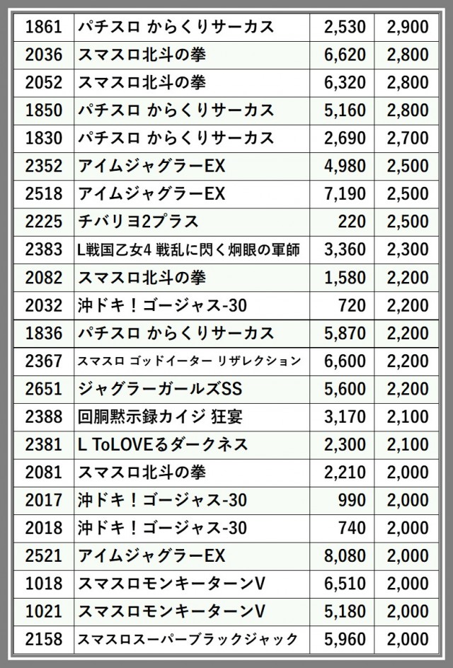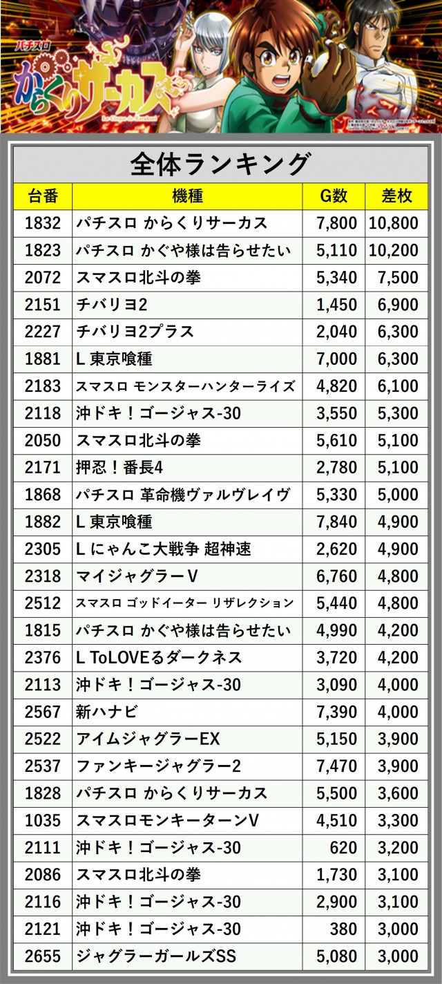 厳選された取材対象機種をはじめ、その他スロット全体から好記録が飛び出した!プレイヤーが楽しんだ1日を下記データにて振り返ってみて欲しい。