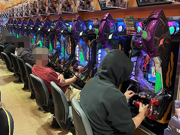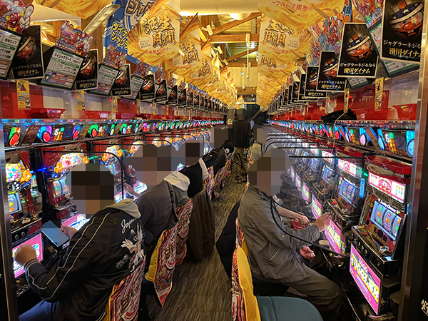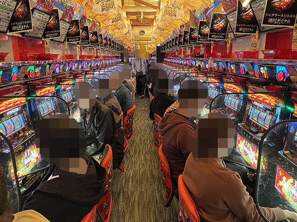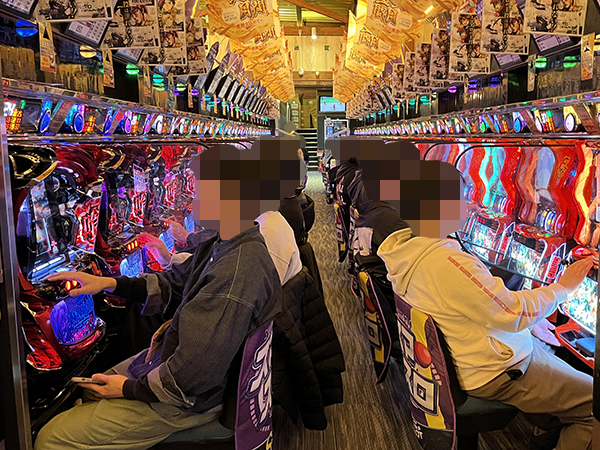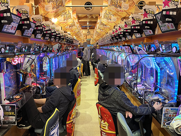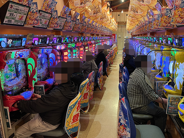 取材時は多くのプレイヤーが来店。パチンコ・パチスロともに、様々な機種が支持を得ていた。