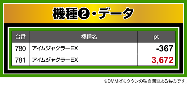 『アイムジャグラーEX』では、781番台が3,672ptを記録。