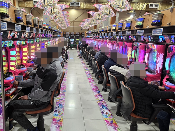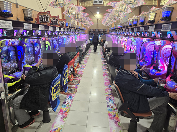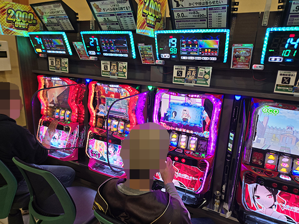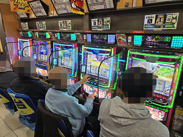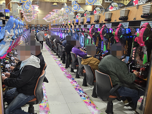 取材時は多くのプレイヤーが来店。パチンコ・パチスロともに、様々な機種が支持を得ていた。