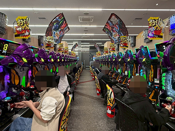 14時半ごろの4円パチンコをチェックすると「新世紀エヴァンゲリオン〜未来への咆哮〜」や「e大海物語5スペシャル」が盛況。プレイヤーたちの満足気な様子が印象に残っている。