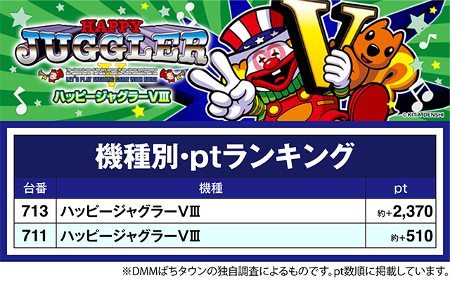 約+2,000ptを超えた台は、「ハッピージャグラーVⅢ」と「ジャグラーガールズSS」でも確認。