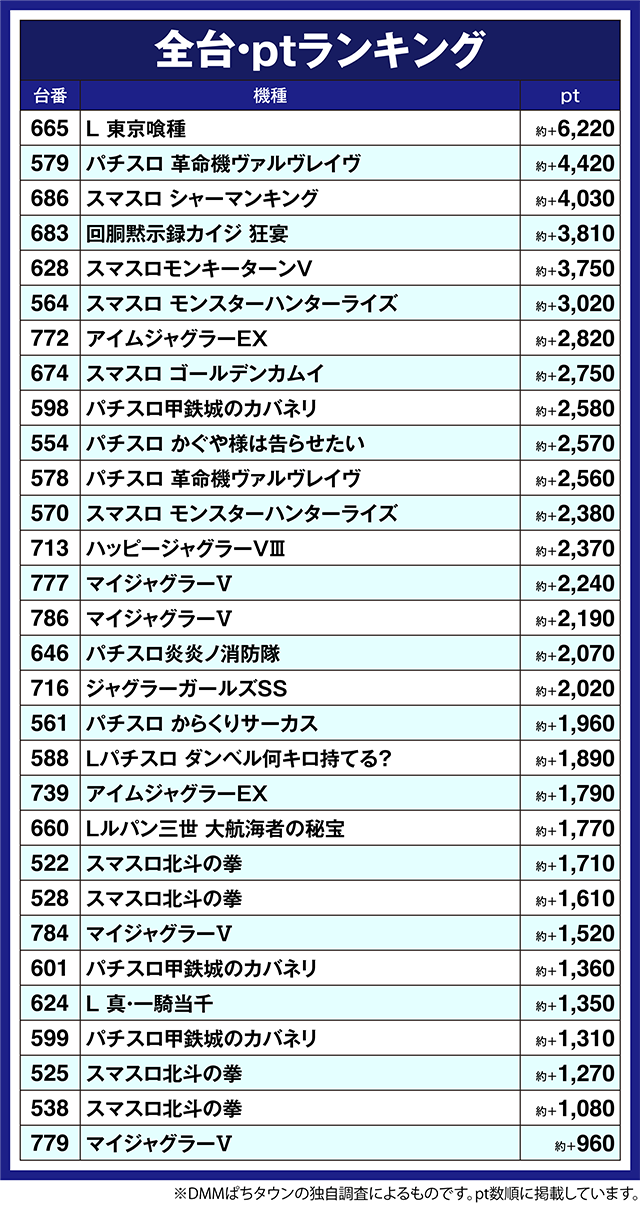 「パチスロ 革命機ヴァルヴレイヴ」の579番台と「スマスロ シャーマンキング」の686番台も約+4,000ptを超えた。