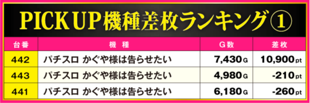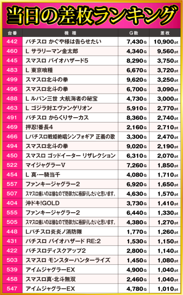 当日の差枚ランキング