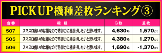 今回のPICK UP機種は全3機種で、差枚上位にランクインした台以外からも好調台を確認。最終的に3機種トータルの全9台中6台がプラス差枚で実戦を終える見事な結果を残しているだけに、ファンにとって充実の一日となったのは間違いないだろう。