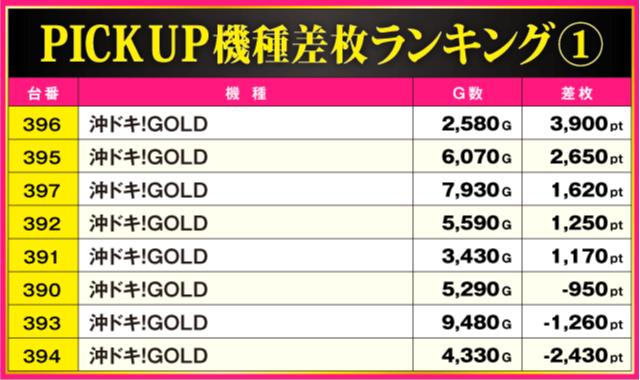 今回のPICK UP機種は全3機種。ランキング上位台以外で目立っていたのが『沖ドキ!GOLD』で、396番台の+3,900pt、395番台の+2,650ptをはじめ全8台中5台がプラス差枚となる見事な結果を残しているだけに、シマ内は常に熱気に包まれていた。