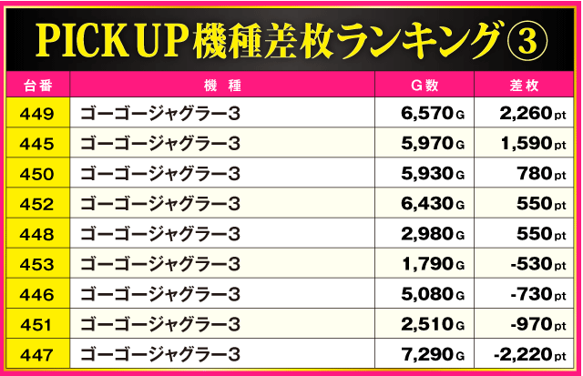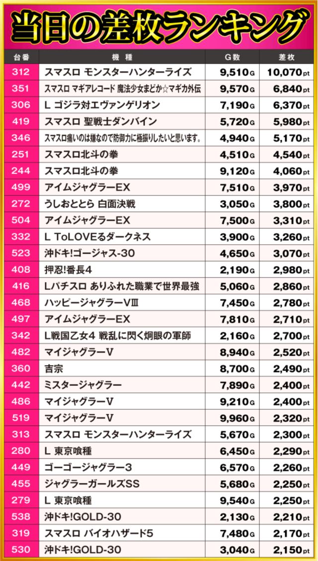 この日は、人気のスマスロを中心にハイスコアが続出。そんな中、『スマスロ モンスターハンターライズ』が万枚超を達成しランキングトップに輝いた。また、Aタイプではジャグラーシリーズが奮闘しており、『アイムジャグラーEX』を筆頭に、差枚TOP30に10台がランクインする盛況ぶりを見せていた。