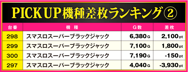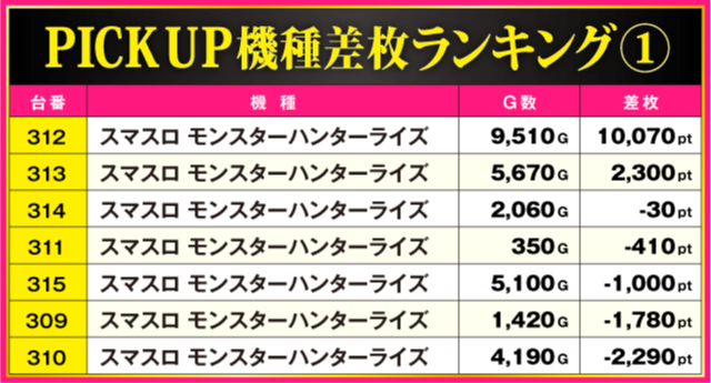 次にPICK UP機種の状況を見ていこう。ランキングを制した『スマスロ モンスターハンターライズ』以外の機種からも多数の好調台を確認。しかも、どの機種も約半数の台がプラス差枚で終了しているだけに、ファンにとっては充実の一日となったのではないだろうか。