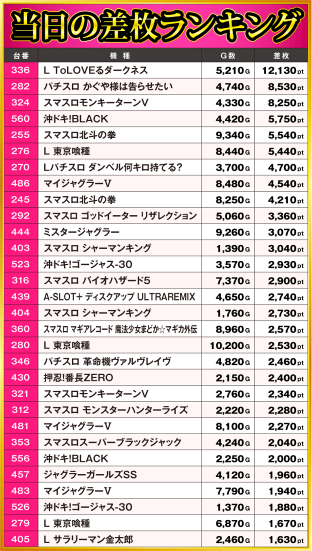 この日は、『L ToLOVEるダークネス』の+12,130ptを筆頭に、『パチスロ かぐや様は告らせたい』と『スマスロモンキーターンV』が+8,000pt超を記録するなど、人気のスマスロを中心にハイスコアが続出。大量設置機種だけでなく、4~5台機種からバラエティまで、広範囲に渡って好調台を確認できた。