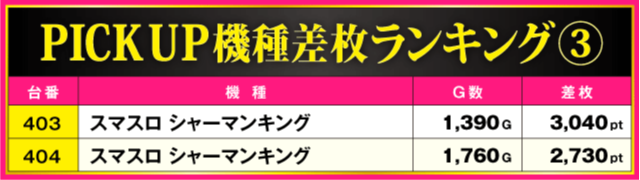 今回のPICK UP機種を全3機種。『L 東京喰種』の+5,440ptをはじめ『スマスロスーパーブラックジャック』と『スマスロ シャーマンキング』からも多数の好成績が発生。3機種トータルの全11台中9台がプラス差枚となっているだけに、ファンにとって充実の一日となったのは間違いないだろう。