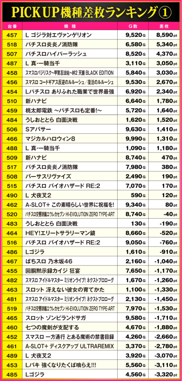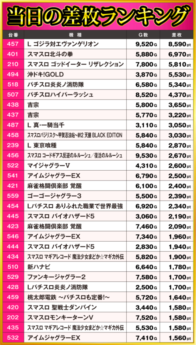 この日の店内状況を見てみると、『L ゴジラ対エヴァンゲリオン』が+8,590ptを叩き出しランキングトップに。次いで『スマスロ北斗の拳』から+6,970pt、『スマスロ ゴッドイーター リザレクション』から+5,810ptと、人気のスマスロを中心に多数のハイスコアが飛び出している。