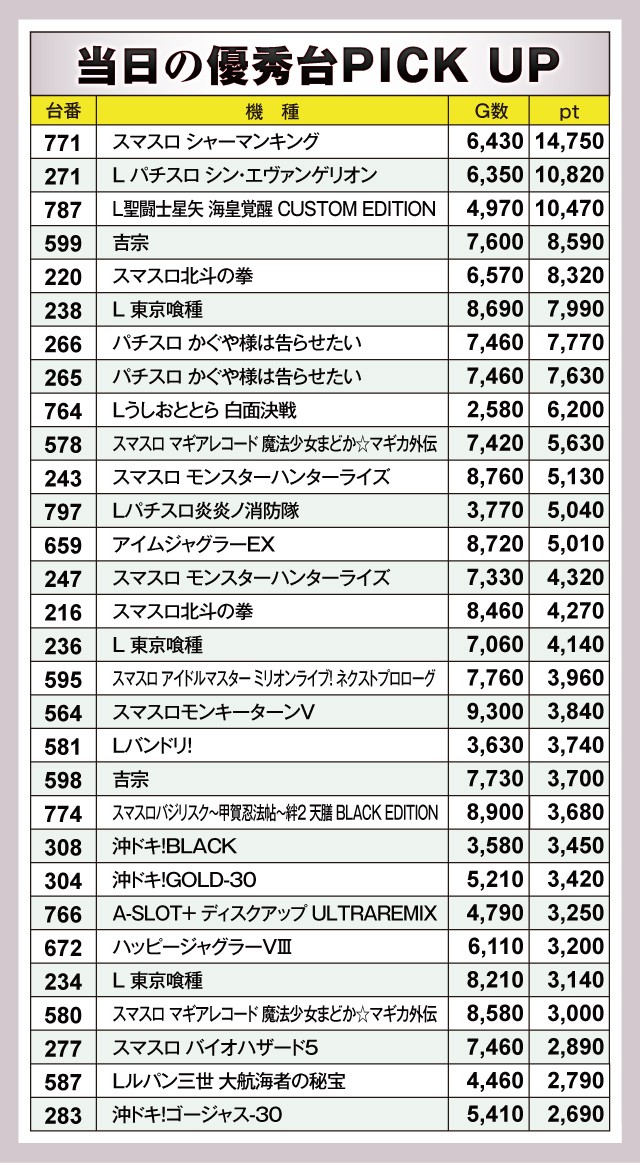 『スマスロ シャーマンキング』771番台+14,750ptをはじめ、『L パチスロ シン・エヴァンゲリオン』271番台+10,820pt、『L聖闘士星矢 海皇覚醒 CUSTOM EDITION』787番台+10,470ptなどあらゆる機種で活気あふれる光景を確認できた。