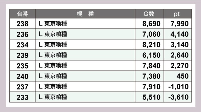 増台した『L 東京喰種』は8台中6台がプラスと絶好調。さらに238番台は+7,000ptオーバーを達成していた。