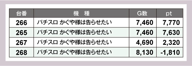 『パチスロ かぐや様は告らせたい』からは+7,000pt超が2台と実に華やかな光景が広がっていた。