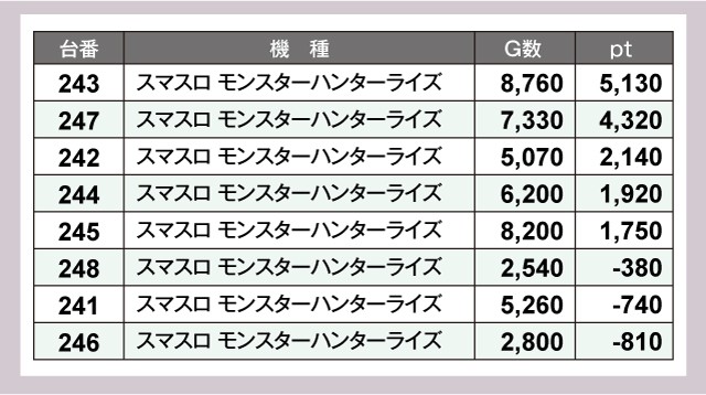 そのほか『スマスロ モンスターハンターライズ』も好評を得ており、243番台+5,130pt、247番台+4,320ptとプレイヤーたちの見事な活躍を確認している。