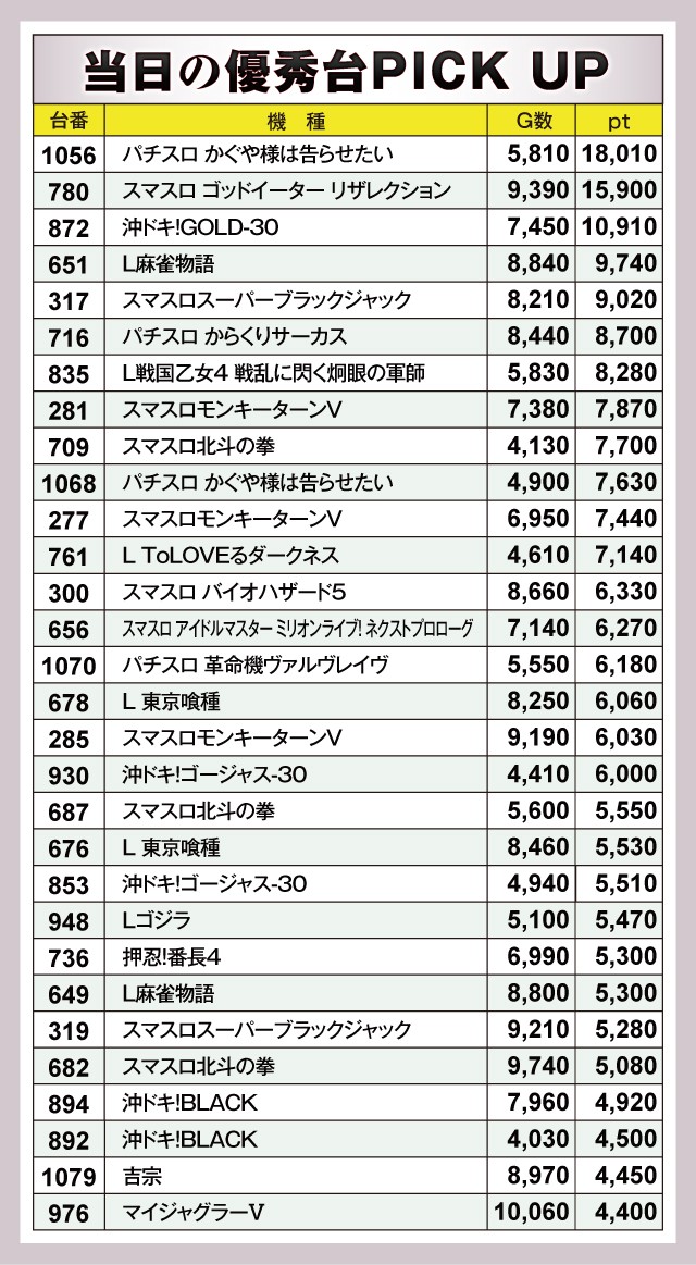 この日は『パチスロ かぐや様は告らせたい』1056番台と『スマスロ ゴッドイーター リザレクション』780番台、『沖ドキ!GOLD-30』872番台が1万ptオーバーを達成!さらにメイン機種から小台数機種まで好調台が並ぶ箇所がそこかしこに誕生していた。