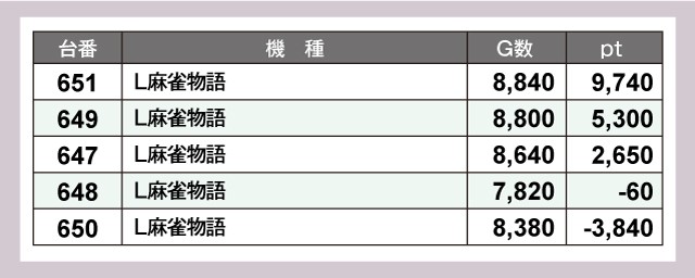 『L麻雀物語』では、4桁pt超の好調台が続出。5台中3台が優秀な結果を残している。