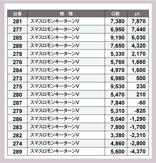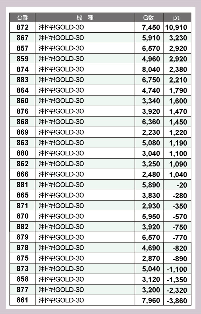 さらに設置台数の多い『沖ドキ!GOLD-30』は半数以上がプラスなほか、872番台の+10,910ptを筆頭に+1,000ptを超える優秀台も多く確認できた。