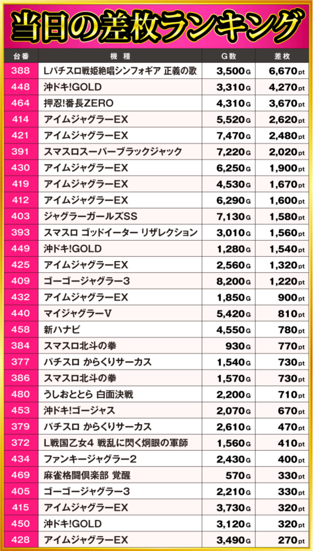 この日は人気機種を中心に好調台を多数確認。そんな中、特に目立っていたのがジャグラーシリーズで、『アイムジャグラーEX』をメインに『ジャグラーガールズSS』や『ゴーゴージャグラー3』、さらには『マイジャグラーⅤ』と、複数の機種が差枚ベスト30にランクインしている。