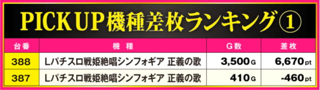 今回のPICK UP機種は全3機種。差枚ランキングでトップに輝いた『Lパチスロ戦姫絶唱シンフォギア 正義の歌』の+6,670ptを筆頭に好調台を多数確認。3機種トータルの全8台中5台がプラス差枚となっているだけに、ファンにとって充実の一日になったのは間違いないだろう。