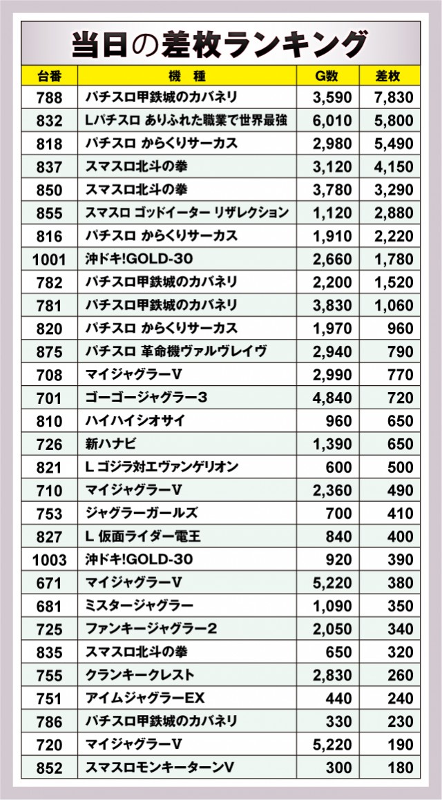 上位にランクインしている台は差枚数的には申し分ない形となったが、中盤から下位にランクインしている台は正直言って物足りないものとなっている。