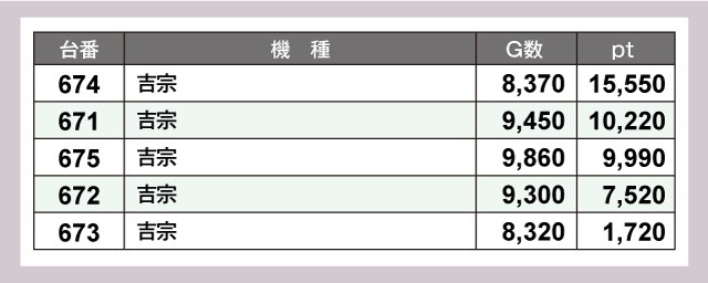 『吉宗』は5台すべてが4桁ptプラスで終了するだけでなく、平均+9,000pt超という凄まじい破壊力を見せつけていた。
