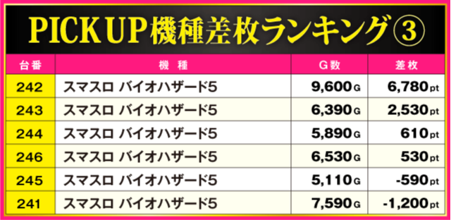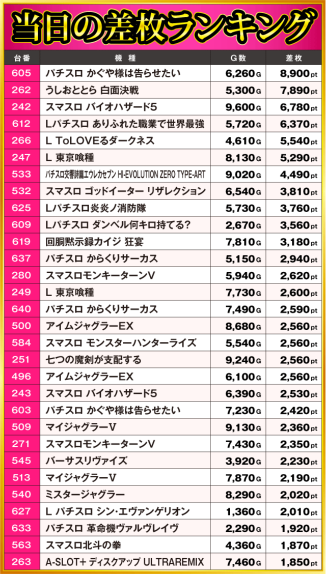 当日の差枚ランキング