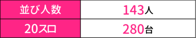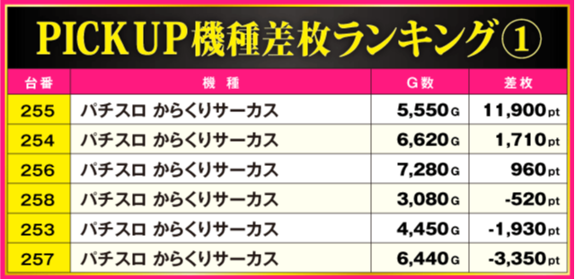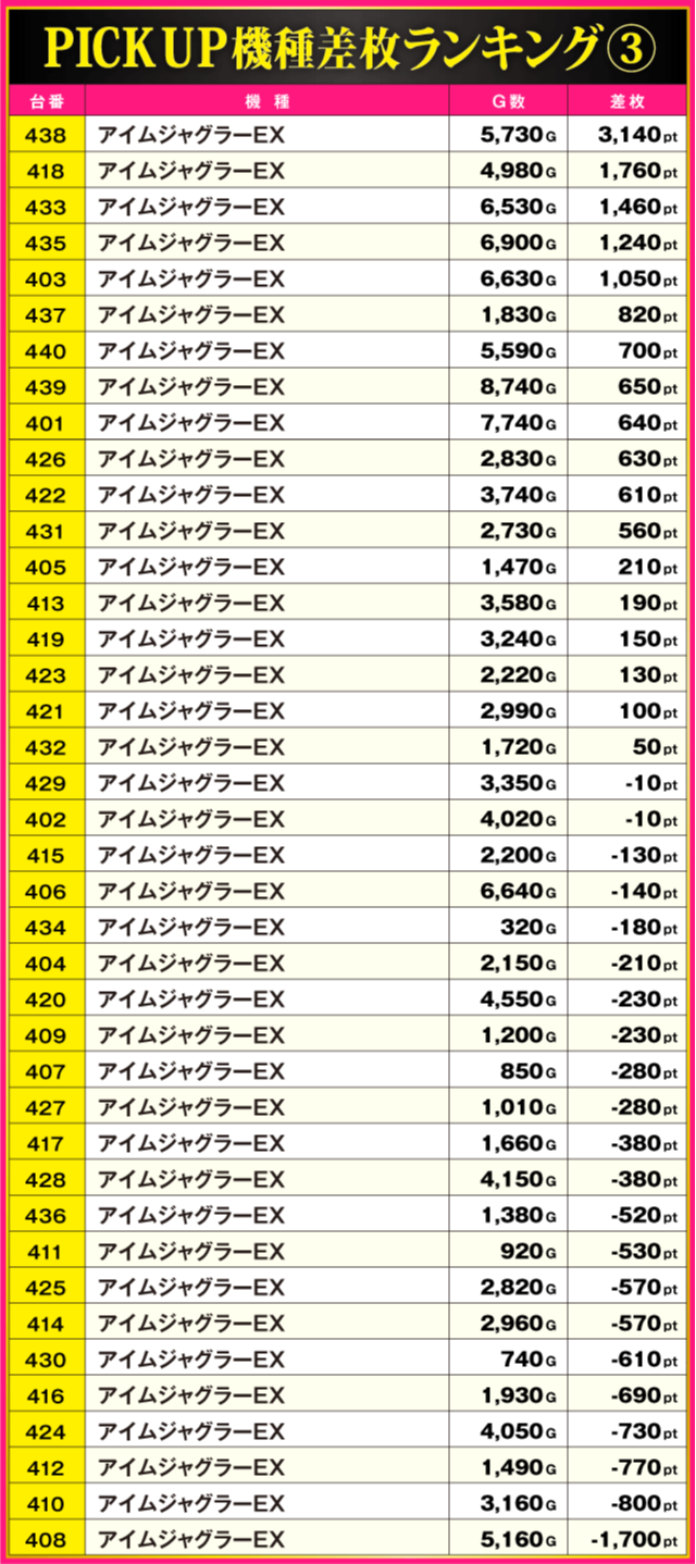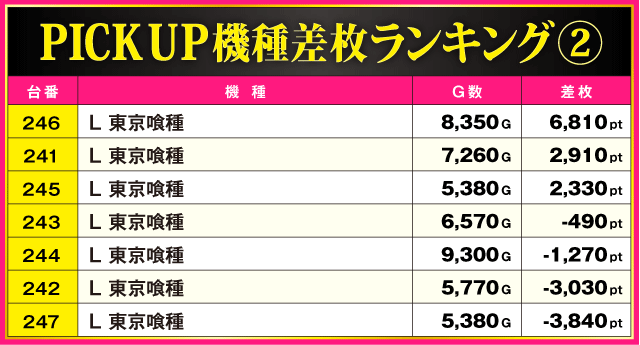 続いてPICK UP機種をチェックしてみよう。差枚上位にランクインした2機種、『パチスロ からくりサーカス』は全6台中3台、『L 東京喰種』は全7台中3台がプラス差枚となる見事な結果を残している。また、同店のメイン機種である『アイムジャグラーEX』は+1,000pt超が4台に+3,000pt超が1台と多数の好調台が確認された。