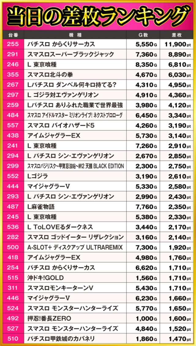 この日は、『パチスロ からくりサーカス』が万枚超の+11,900ptを叩き出し堂々のランキングトップに。次いで『スマスロスーパーブラックジャック』+8,890pt、『L 東京喰種』と『スマスロ北斗の拳』が+6,000pt超を記録するなど、人気のスマスロを中心にハイスコアが続出している。