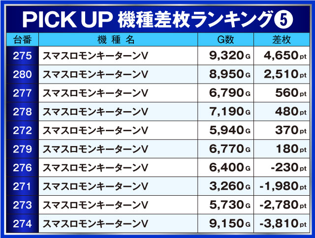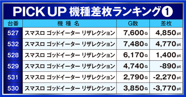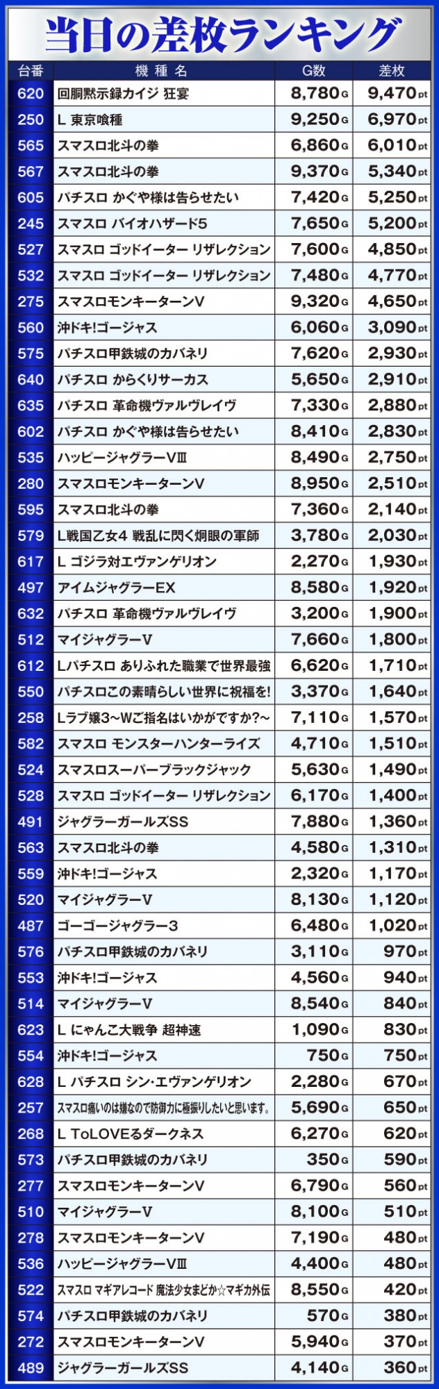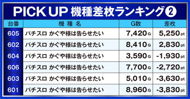 以下、『パチスロ かぐや様は告らせたい』605番台など3台が+5,000ptオーバー。『スマスロ ゴッドイーター リザレクション』527番台など3台が+4,000ptオーバーと、優秀台がズラリと並ぶ壮観なランキングを形成していた。
