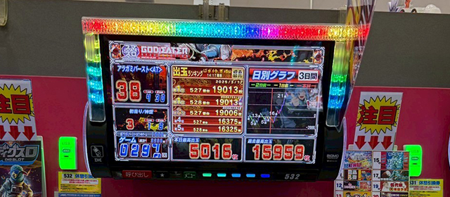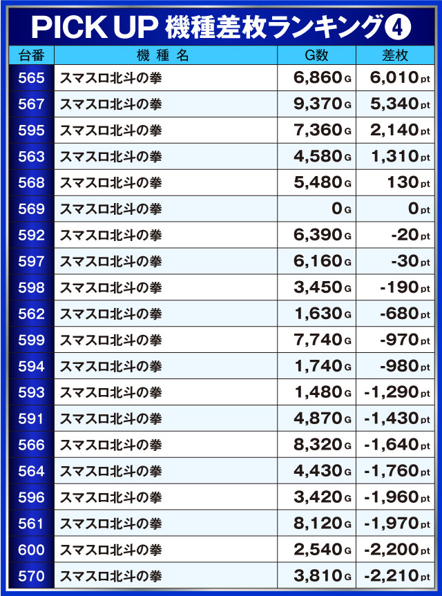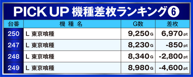つづいて『L 東京喰種』250番台が+6,970pt。『スマスロ北斗の拳』565番台が+6,010ptと、誰もがうらやむ差枚ptを残している。
