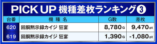 とはいえ同じ機種の中でも明暗が別れている台はあり、『回胴黙示録カイジ 狂宴』はしっかり回された620番台と物足りなかった619番台で、差枚にして1万pt以上の開きが生まれている。