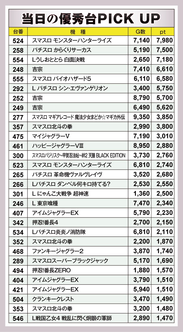 この日は『スマスロ モンスターハンターライズ』524番台や『パチスロ からくりサーカス』258番台、『Lうしおととら 白面決戦』554番台が+7,000ptオーバー。次いで『吉宗』や『スマスロ バイオハザード5』も+6,000ptオーバーと理想的な展開を迎えていた。