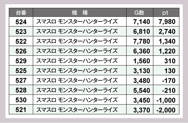 『スマスロ モンスターハンターライズ』では半数以上がプラスとなっており、524番台が+7,980ptと見事な記録を残している。