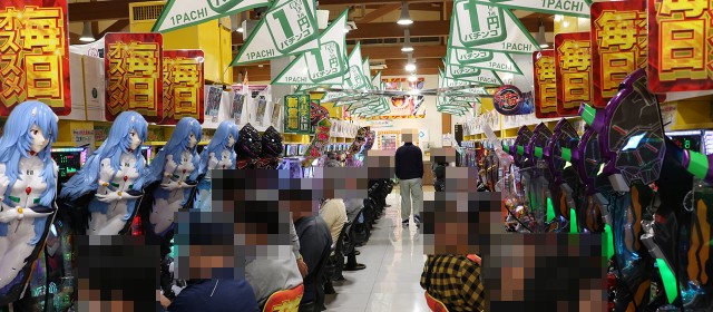 一方で1パチの稼働率は極めて高く、『PA大海物語5 Withアグネス・ラム』やエヴァシリーズ各種にはファンがビッシリ。中には大当りを順調に重ねている台をカウントできた。