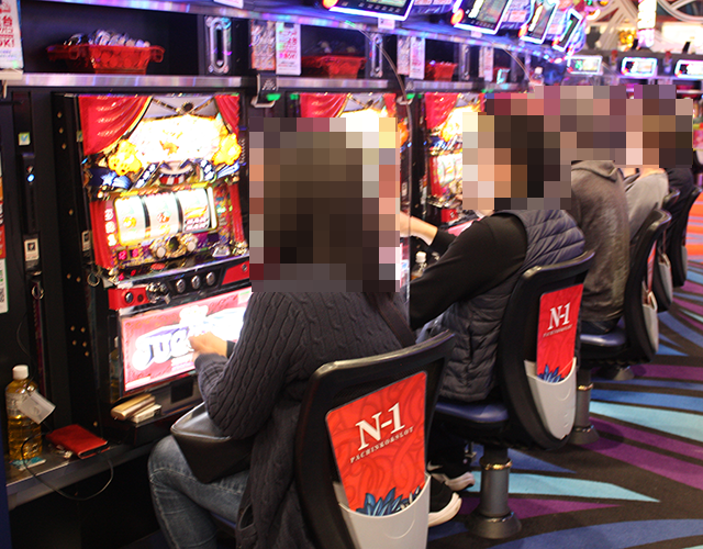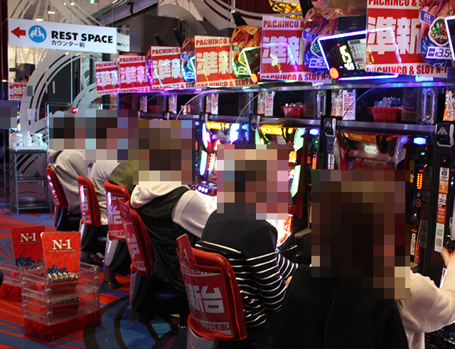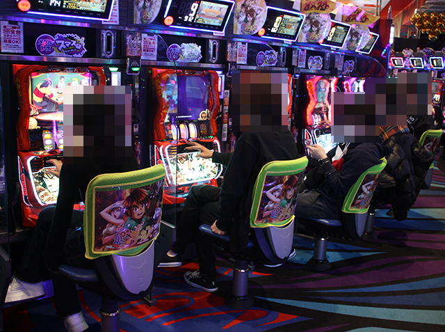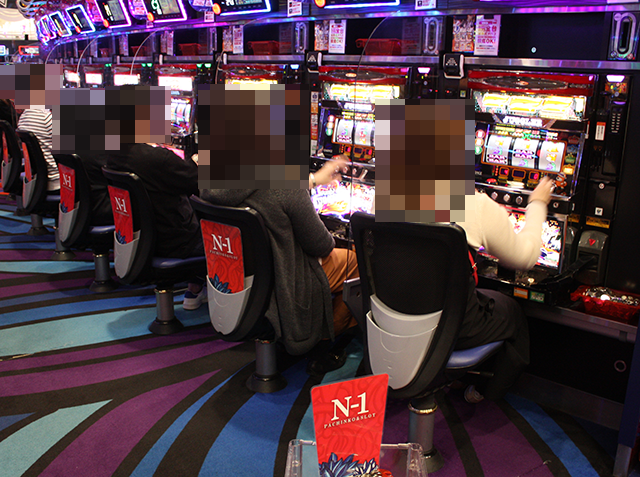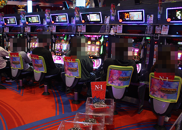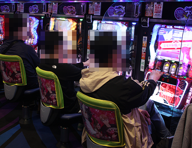 パチスロコーナーをみてみると、AT機やボーナスタイプなど、さまざまな機種が楽しまれていた。