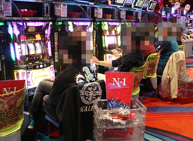 取材時は「ファンキージャグラー2」に空き台がなく、プレイヤーは2箱以上の持ち玉で遊技中。