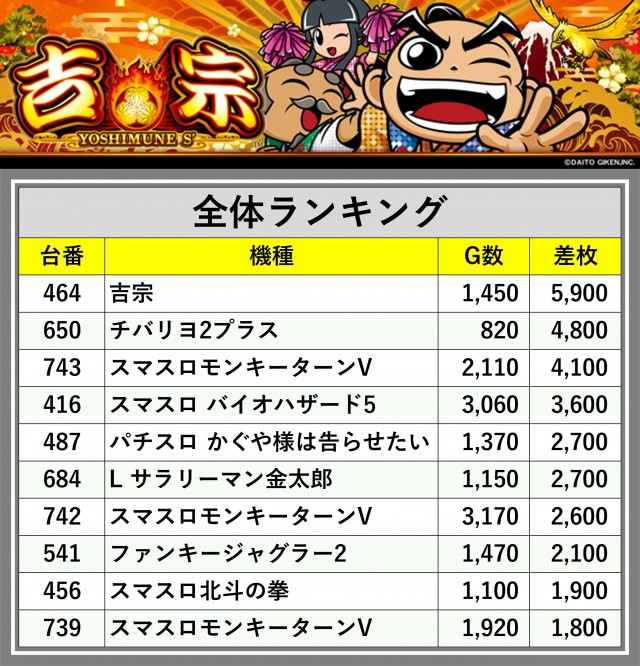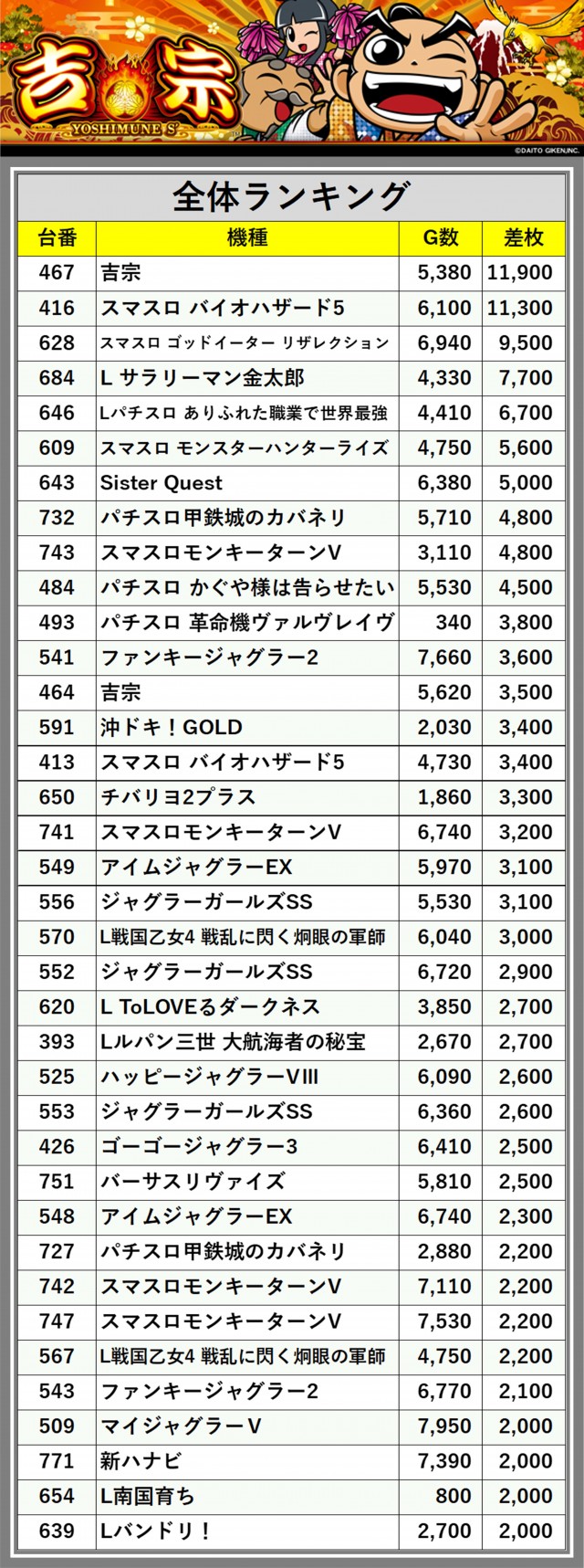 ※差枚数順に掲載しています