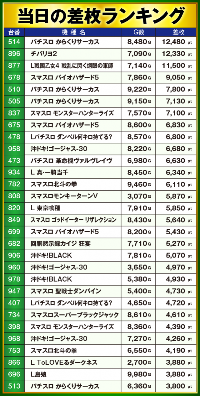 レポートの最後に「Super D’STATION高崎本店」の差枚ランキングも掲載!