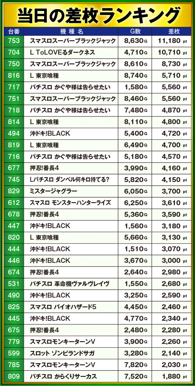 ※差枚数順に掲載しています