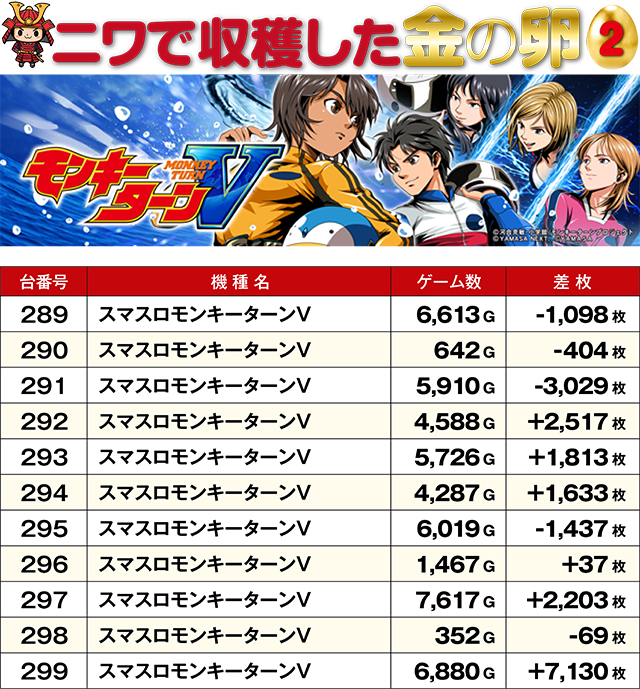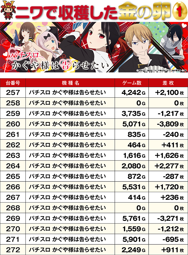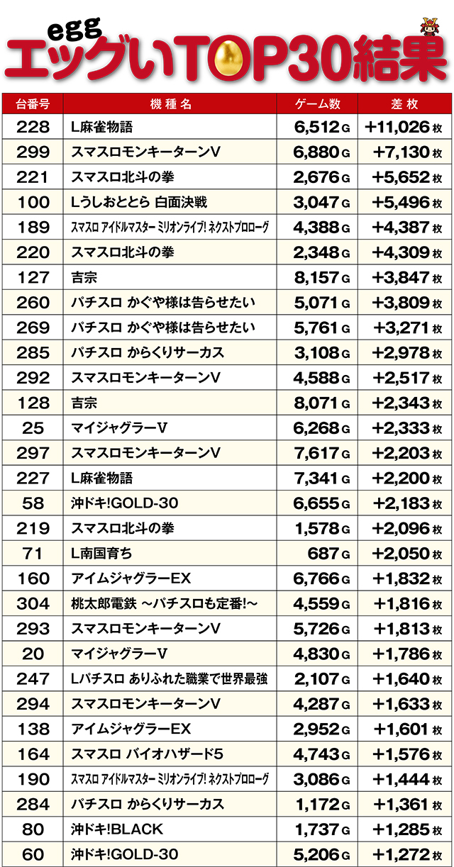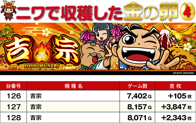 最新機種である『L麻雀物語』からさっそく11,000枚超えレコードがお目見え!新台の強さをまざまざと見せつけてくれた。プラス台の多かった『パチスロ かぐや様は告らせたい』&『スマスロモンキーターンV』島では、笑顔でレバーを叩く方を多く目撃。また全台プラスを達成した『吉宗』はこの日のMVPと言っても過言ではない存在感を示していた!