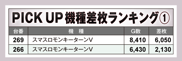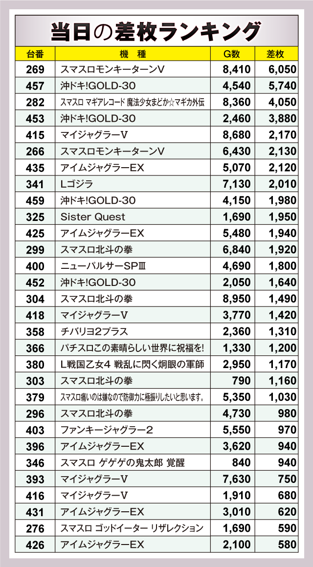今回のPICK UP機種は全4機種。『スマスロモンキーターンV』』と『沖ドキ!GOLD-30』は、差枚上位にランクインした台以外からも複数の好調台を確認できた。また、ジャグラーシリーズも奮闘しており、最終的にプラス差枚で終了した台が多く、ファンにとっては充実の一日となったのは間違いないだろう。