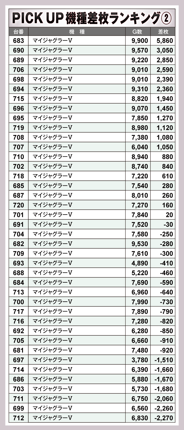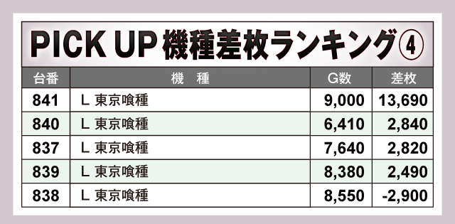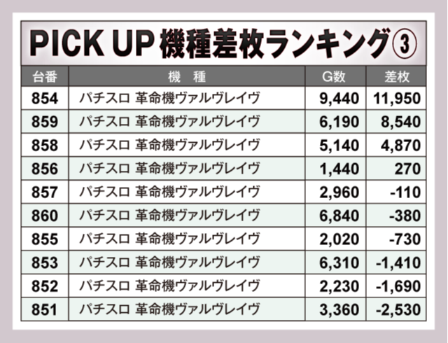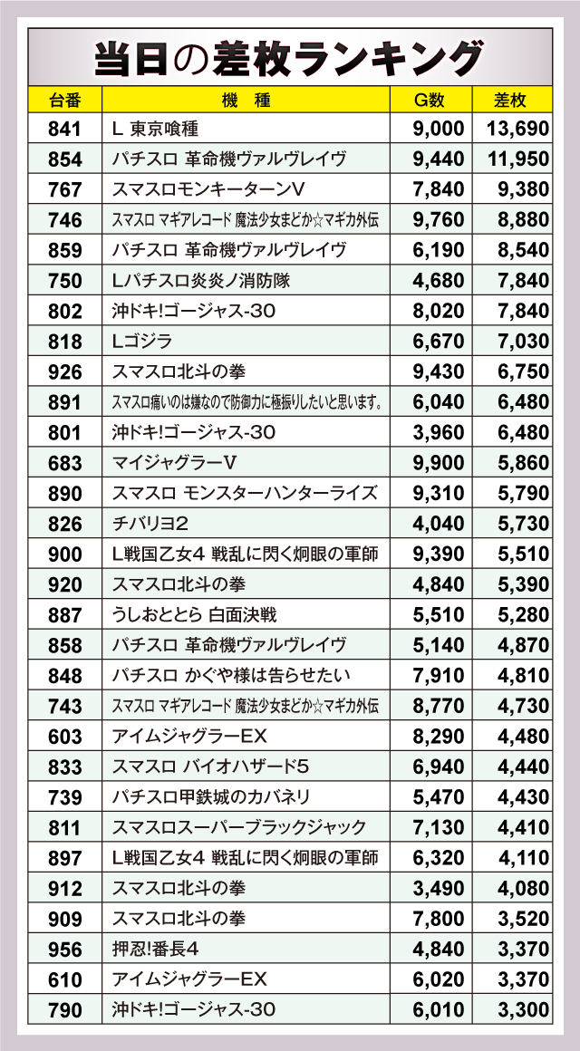 この日の店内状況をチェックすると、『L 東京喰種』が+13,690枚、『パチスロ 革命機ヴァルヴレイヴ』が+11,950枚を叩き出しプレイヤーの注目を集めていた。また、その他の機種では『スマスロモンキーターンV』が+9,380枚、『スマスロ マギアレコード 魔法少女まどか☆マギカ外伝』が+8,880枚と万枚に迫る勢いを見せつけている。